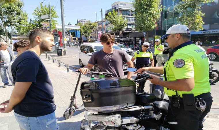 Bağdat Caddesi’nde elektrikli scooter sürücülerine yönelik denetim gerçekleştirildi. Fosforlu yelek giymedikleri, kask takmadıkları ve scooter’u kaldırımda kullandıkları belirlenen kişilere 951’er Türk Liras para cezası kesildi.