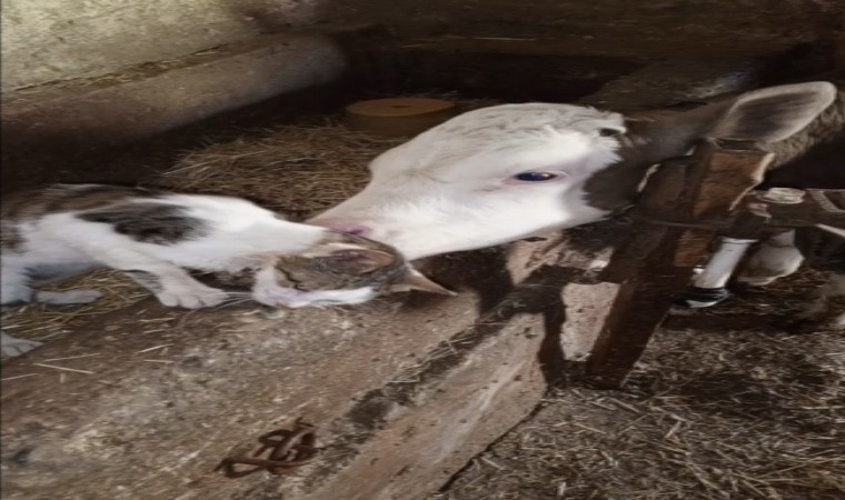Eskişehir’de ahırda bağlı olan arkadaşı buzağıyı neredeyse her gün ziyaret eden kedinin halleri görenleri gülümsetti.