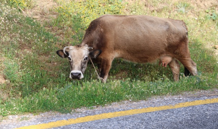 Bahar aylarının gelmesiyle birlikte yol kenarlarında kendiliğinden yetişen yemyeşil otlar kırsal kesimdeki hayvanlar için adeta açık hava merası haline geliyor.