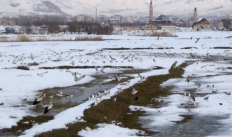 Türkiye’nin en soğuk illeri arasında bulunan ve havaların ısınmasıyla birlikte Van’a gelen leylekler, her yıl olduğu gibi bu kış da sıcak yerlere göç etti. Çoğu leylek, sıcak bölgelere göç ederken Van’ın İpekyolu ilçesindeki 4 leylek ise göç etmeyerek yuvalarında kaldı. Kar yağışı ve dondurucu soğuğa rağmen ilçede kalan leylekler doğadan besleniyor. Van Kalesi’nin güneyini mesken tutan leylekler, burada martılarla birlikte yaşam mücadelesi veriyor.