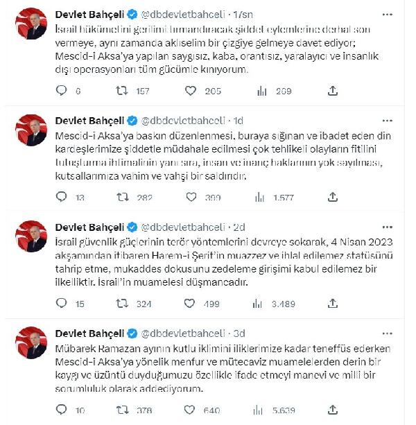 MHP lideri Bahçeli, Twitter hesabından yaptığı açıklamada, "Mübarek Ramazan ayının kutlu iklimini iliklerimize kadar teneffüs ederken Mescid-i Aksa'ya yönelik menfur ve mütecaviz muamelelerden derin bir kaygı ve üzüntü duyduğumuzu özellikle ifade etmeyi manevi ve milli bir sorumluluk olarak addediyorum. İsrail güvenlik güçlerinin terör yöntemlerini devreye sokarak, 4 Nisan 2023 akşamından itibaren Harem-i Şerif'in muazzez ve ihlal edilemez statüsünü tahrip etme, mukaddes dokusunu zedeleme girişimi kabul edilemez bir ilkelliktir. İsrail'in muamelesi düşmancadır" dedi.