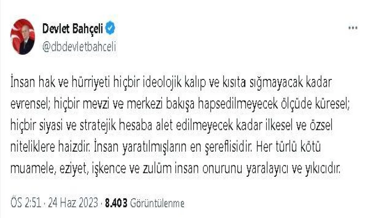 MHP Genel Başkanı Devlet Bahçeli, Uygur davasının savunucusu Rabia Kadir'in ABD'de yaşadığını ve Türkiye'ye ziyaretinin önündeki engellerin kaldırılması temennisinde bulundu. Bahçeli, insan hak ve hürriyetinin evrensel olduğunu vurgulayarak, insanların her türlü kötü muamele, eziyet, işkence ve zulme maruz kalmamaları gerektiğini söyledi.