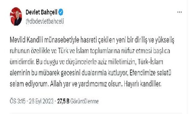 ANKARA, (DHA)- MHP Genel Başkanı Devlet Bahçeli, Türk-İslam aleminin ve tüm vatandaşların Mevlit Kandili’ni kutladı.