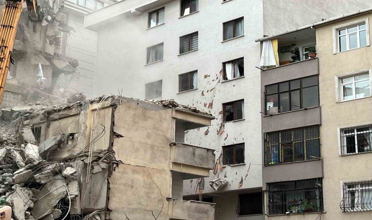 Bahçelievler’de riskli bir binanın yıkım çalışmaları sırasında kopan moloz parçaları, arka cephede bulunan apartmana çarptı. Olayda apartmanın dış yüzeyi zarar görürken bazı dairelerin camları kırıldı.
