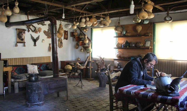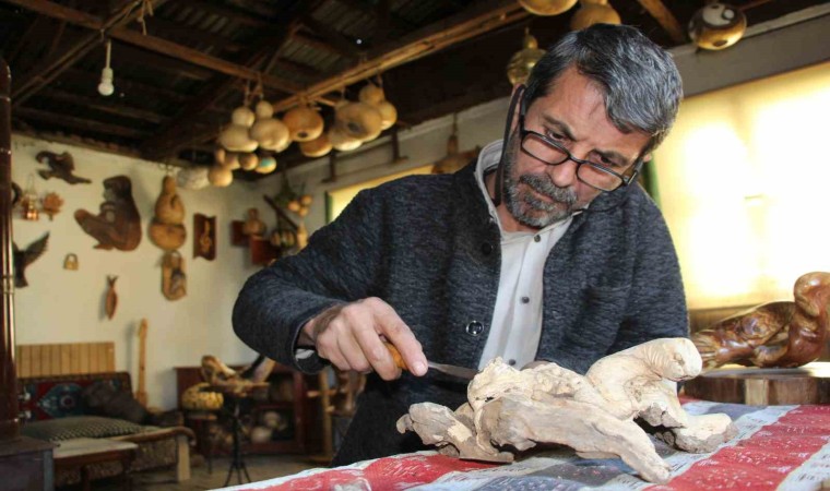Bingöl’de yaşayan Yılmaz Kaya (53), küçük yaşlarda babasının tıraş olduğu fırçayı resim fırçasına dönüştürmesiyle başladığı sanata, doğada bulduğu kemikleşmiş odunlara çeşitli şekiller vererek sürdürüyor.