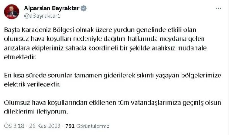 Bakan Bayraktar, sosyal medya hesabından yaptığı açıklamada, "Başta Karadeniz Bölgesi olmak üzere yurdun genelinde etkili olan olumsuz hava koşulları nedeniyle dağıtım hatlarında meydana gelen arızalara, ekiplerimiz sahada koordineli bir şekilde aralıksız müdahale etmektedir. En kısa sürede sorunlar tamamen giderilerek sıkıntı yaşayan bölgelerimize elektrik verilecektir. Olumsuz hava koşullarından etkilenen tüm vatandaşlarımıza geçmiş olsun dileklerimi iletiyorum" dedi. (DHA)