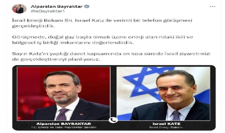 ANKARA, (DHA)- ENERJİ ve Tabii Kaynaklar Bakanı Alparslan Bayraktar, İsrail Enerji Bakanı Israel Katz ile telefonda görüştü.