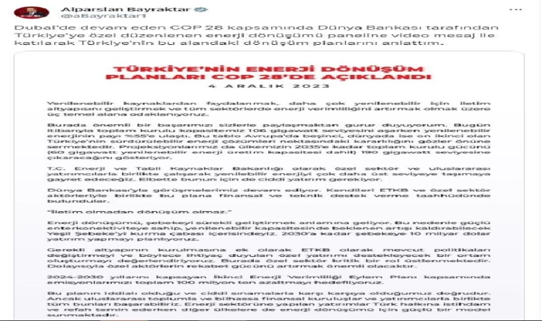 Enerji ve Tabii Kaynaklar Bakanı Alparslan Bayraktan, sosyal medya hesabından yaptığı palşımda, Dubai’de devam eden COP 28 kapsamında Dünya Bankası tarafından Türkiye’ye özel düzenlenen enerji dönüşümü paneline video mesaj ile katılarak, Türkiye'nin bu alandaki dönüşüm planlarını anlattığını duyurdu. Bayraktar, bakanlık olarak 3 temel alana odaklandıklarını belirterek bunları, yenilenebilir kaynaklardan faydalanmak, daha çok yenilenebilir için iletim altyapısını geliştirmek ve tüm sektörlerde enerji verimliliğini artırmak olarak sıraladı. Bayraktar, "Burada önemli bir başarımızı sizlerle paylaşmaktan gurur duyuyorum. Bugün itibarıyla toplam kurulu kapasitemiz 106 gigawatt seviyesini aşarken yenilenebilir enerjinin payı yüzde 55'e ulaştı. Bu tablo Avrupa'da 5'inci, dünyada ise 12'inci olan Türkiye'nin sürdürülebilir enerji çözümleri noktasındaki kararlılığını gözler önüne sermektedir. Projeksiyonlarımız da ülkemizin 2035'e kadar toplam kurulu gücünü, 60 gigawatt yenilenebilir enerji üretim kapasitesi dahil 190 gigawatt seviyesine çıkaracağını gösteriyor" ifadeleri kullanıldı.