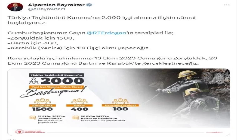 Cumhurbaşkanı Recep Tayyip Erdoğan'ın TTK'ya 2 bin işçi alınacağı yönündeki açıklamasının ardından; Bakan Bayraktar, sosyal medya hesabından yaptığı paylaşımda, TTK'ya işçi alımı sürecini başlattıklarını belirtti. Bayraktar, "Türkiye Taşkömürü Kurumu'na 2 bin işçi alımına ilişkin süreci başlatıyoruz. Cumhurbaşkanımız Sayın Recep Tayyip Erdoğan'ın tensipleri ile; Zonguldak için 1500, Bartın için 400, Karabük Yenice için 100 işçi alımı yapacağız" dedi. Bayraktar, kura yoluyla işçi alımlarını 13 Ekim'de Zonguldak, 20 Ekim'de ise Bartın ve Karabük’te yapılacağını bildirdi. (DHA)