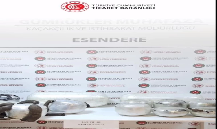 ANKARA, (DHA)- TİCARET Bakanı Ömer Bolat, "Esendere Gümrük Kapısında görev yapan Ticaret Bakanlığımıza bağlı Gümrük Muhafaza ekiplerimizce, yurda giriş yapan iki araçta gerçekleştirilen kontrollerde 119,7 kg afyon sakızı cinsi uyuşturucu ele geçirilmiştir" dedi.