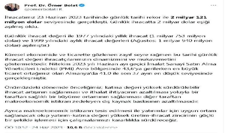 TİCARET Bakanı Ömer Bolat, "23 Haziran 2023 tarihinde günlük tarihi rekor ile 2 milyar 121 milyon dolar seviyesinde gerçekleşen ihracatımızı görmekten memnuniyet duyuyorum. Bu başarı ile günlük ihracatta 2 milyar dolar eşiğini aşmış olduk" şeklinde bir açıklama yaptı.
