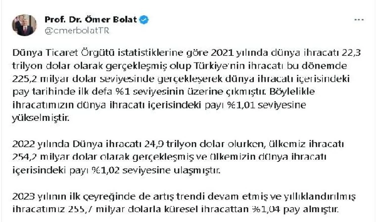 ANKARA, (DHA)- TİCARET Bakanı Ömer Bolat, 2023 yılının ilk çeyreğinde Türkiye'nin yıllıklandırılmış ihracatının 255,7 milyar dolarla küresel ihracattan yüzde 1,04 pay aldığını açıkladı.