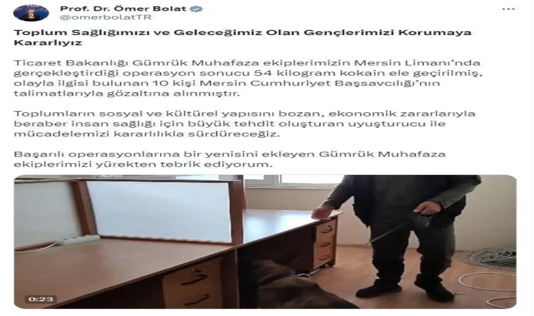 Bakan Bolat, sosyal medya hesabından yaptığı açıklamada, "Toplum sağlığımızı ve geleceğimiz olan gençlerimizi korumaya kararlıyız. Ticaret Bakanlığı gümrük muhafaza ekiplerimizin Mersin Limanı’nda gerçekleştirdiği operasyon sonucu 54 kilo kokain ele geçirilmiş, olayla ilgisi bulunan 10 kişi Mersin Cumhuriyet Başsavcılığı’nın talimatlarıyla gözaltına alınmıştır. Toplumların sosyal ve kültürel yapısını bozan, ekonomik zararlarıyla beraber insan sağlığı için büyük tehdit oluşturan uyuşturucu ile mücadelemizi kararlılıkla sürdüreceğiz. Başarılı operasyonlarına bir yenisini ekleyen gümrük muhafaza ekiplerimizi yürekten tebrik ediyorum" dedi. (DHA)
