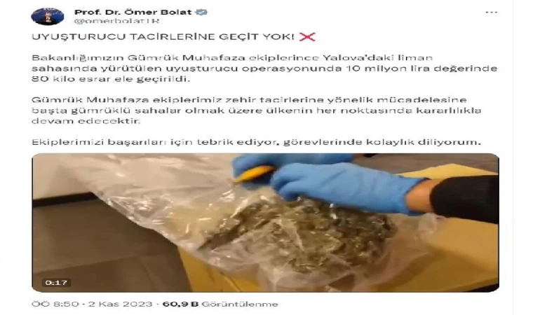 Ticaret Bakanı Ömer Bolat, sosyal medya hesabından yaptığı açıklamada, "Uyuşturucu tacirlerine geçit yok. Bakanlığımızın Gümrük Muhafaza ekiplerince Yalova'daki liman sahasında yürütülen uyuşturucu operasyonunda 10 milyon lira değerinde 80 kilo esrar ele geçirildi. Gümrük Muhafaza ekiplerimiz zehir tacirlerine yönelik mücadelesine başta gümrüklü sahalar olmak üzere ülkenin her noktasında kararlılıkla devam edecektir. Ekiplerimizi başarıları için tebrik ediyor, görevlerinde kolaylık diliyorum" dedi. (DHA)
