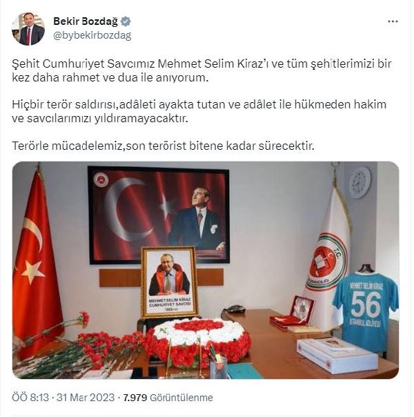 Adalet Bakanı Bekir Bozdağ, 31 Mart 2015 tarihinde şehit edilen Cumhuriyet Savcısı Mehmet Selim Kiraz'ı yıl dönümünde anarak bir mesaj paylaştı.