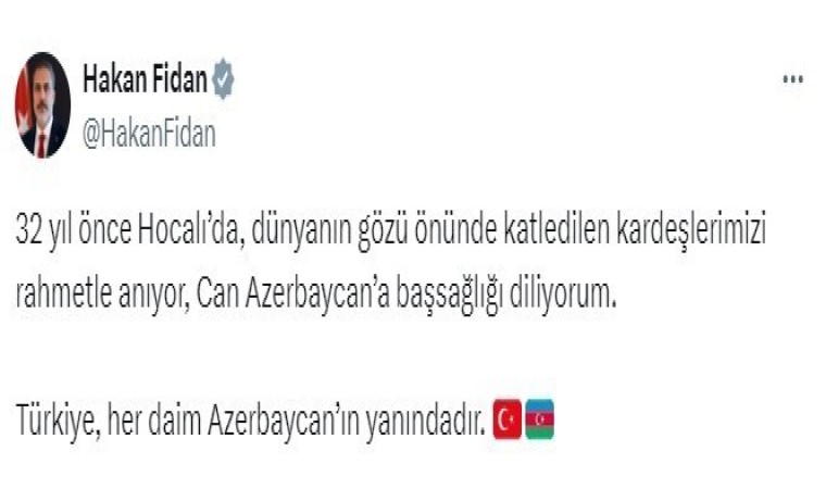 Dışişleri Bakanı Hakan Fidan, Hocalı Katliamı’nın yıl dönümü sebebiyle sosyal medya hesabından, “32 yıl önce Hocalı’da, dünyanın gözü önünde katledilen kardeşlerimizi rahmetle anıyor, Can Azerbaycan’a başsağlığı diliyorum. Türkiye, her daim Azerbaycan’ın yanındadır” paylaşımında bulundu.