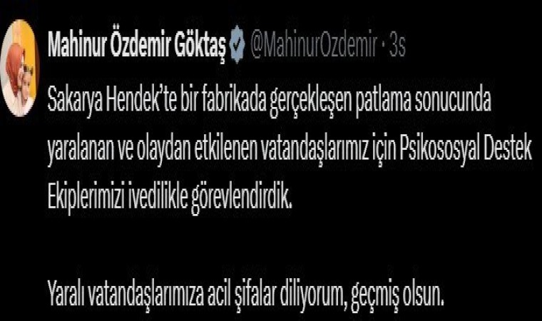 Aile ve Sosyal Hizmetler Bakanı Mahinur Özdemir Göktaş, patlama neticesinde yaralanan ve olaydan etkilenen vatandaşlar için psikososyal destek ekiplerini bölgeye gönderdiklerini duyurdu. Bakan Göktaş, sosyal medya hesabından yaptığı açıklamada, “Sakarya Hendek’te bir fabrikada gerçekleşen patlama sonucunda yaralanan ve olaydan etkilenen vatandaşlarımız için psikososyal destek ekiplerimizi ivedilikle görevlendirdik. Yaralı vatandaşlarımıza acil şifalar diliyorum, geçmiş olsun” ifadelerine yer verdi.