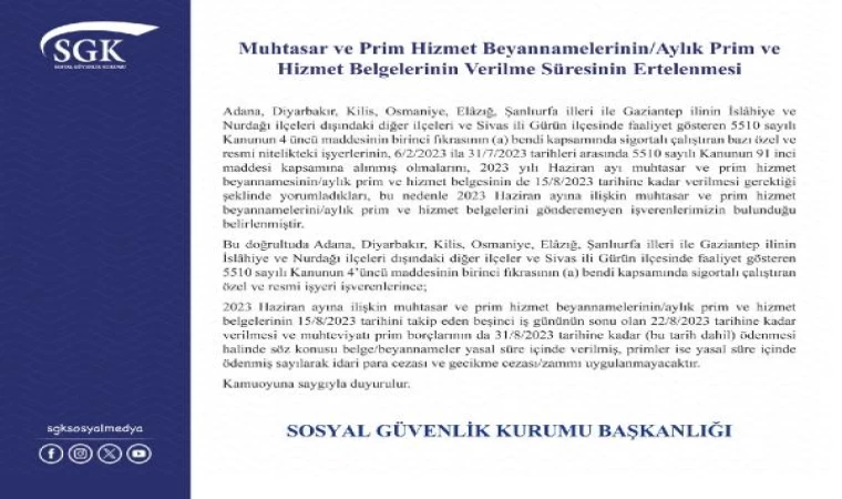 Bakan Işıkhan'ın sosyal medya hesabından paylaştığı, depremden etkilenen illerde prim ve hizmet belgelerinin teslim süresinin uzatılmasına ilişkin Sosyal Güvenlik Kurumu (SGK) tarafından yapılan açıklamada, "Adana, Diyarbakır, Kilis, Osmaniye, Elazığ, Şanlıurfa illeri ile Gaziantep ilinin İslahiye ve Nurdağı ilçeleri dışındaki diğer ilçeleri ve Sivas ili Gürün ilçesinde faaliyet gösteren 5510 sayılı Kanunun 4'üncü maddesinin birinci fıkrasının (a) bendi kapsamında sigortalı çalıştıran bazı özel ve resmi nitelikteki işyerlerinin, 06.02.2023 ila 31.07.2023 tarihleri arasında 5510 sayılı Kanunun 91'inci maddesi kapsamına alınmış olmalarını, 2023 yılı Haziran ayı muhtasar ve prim hizmet beyannamesinin/aylık prim ve hizmet belgesinin de 15.08.2023 tarihine kadar verilmesi gerektiği şeklinde yorumladıkları, bu nedenle 2023 Haziran ayına ilişkin muhtasar ve prim hizmet beyannamelerini/aylık prim ve hizmet belgelerini göndermeyen işverenlerimizin bulunduğu belirlenmiştir. Bu doğrultuda Adana, Diyarbakır, Kilis, Osmaniye, Elazığ, Şanlıurfa illeri ile Gaziantep ilinin İslahiye ve Nurdağı ilçeleri dışındaki diğer ilçeler ve Sivas ili Gürün ilçesinde faaliyet gösteren 5510 sayılı Kanunun 4'üncü maddesinin birinci fıkrasının (a) bendi kapsamında sigortalı çalıştıran özel ve resmi işyeri işverenlerince; 2023 Haziran ayına ilişkin muhtasar ve prim hizmet beyannamelerinin/aylık prim ve hizmet belgelerinin 15.08.2023 tarihini takip eden beşinci iş gününün sonu olan 22.08.2023 tarihine kadar verilmesi ve muhteviyatı prim borçlarının da 31.08.2023 tarihine kadar (bu tarih dahil) ödenmesi halinde söz konusu belge/beyannameler yasal süre içinde verilmiş, primler ise yasal süre içinde ödenmiş sayılarak idari para cezası ve gecikme cezası/zammı uygulanmayacaktır. Kamuoyuna saygıyla duyurulur" denildi. (DHA)