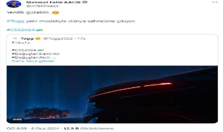 ANKARA, (DHA)- SANAYİ ve Teknoloji Bakanı Mehmet Fatih Kacır, "Yenilik güzeldir. Togg, yeni modeliyle dünya sahnesine çıkıyor" dedi.