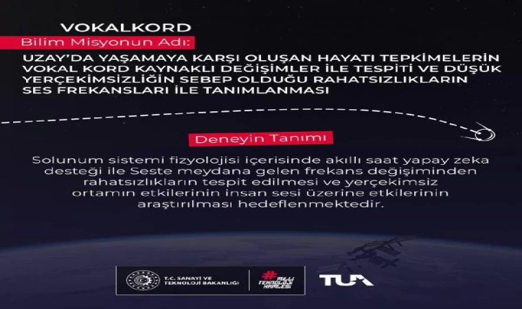 Sanayi ve Teknoloji Bakanı Mehmet Kacır, sosyal medya hesabından yaptığı açıklamada, "Deney 4: 'VOKALKORD' Türk Uzay Bilim Misyonundaki onüç deneyden biri olan 'VOKALKORD' deneyi ile; 'Mikro yerçekimi ortamında ortaya çıkan rahatsızlıklar sesteki frekans değişimleri ile tespit edilebilir mi?' sorusunun cevabı aranıyor" dedi. (DHA)
