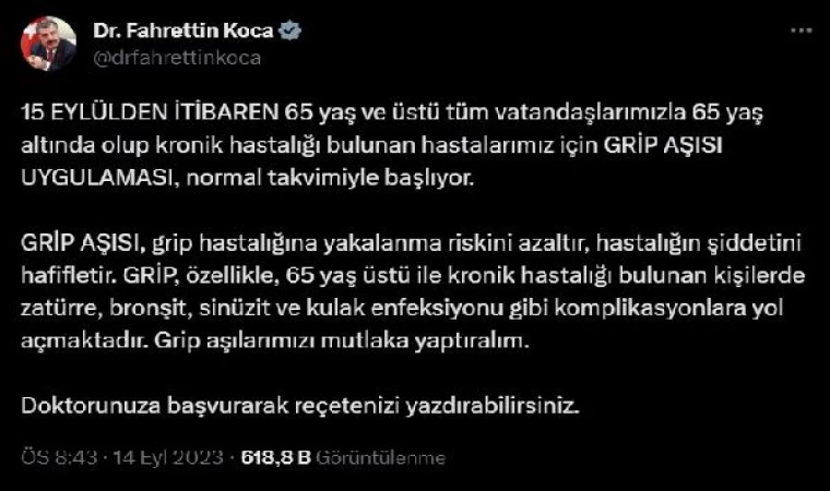 Bakan Koca, sosyal medya hesabından yaptığı açıklamada, "15 Eylül'den itibaren 65 yaş ve üstü tüm vatandaşlarımızla 65 yaş altında olup kronik hastalığı bulunan hastalarımız için grip aşısı uygulaması, normal takvimiyle başlıyor. Grip aşısı, grip hastalığına yakalanma riskini azaltır, hastalığın şiddetini hafifletir. Grip, özellikle 65 yaş üstü ve kronik hastalığı bulunan kişilerde zatürre, bronşit, sinüzit ve kulak enfeksiyonu gibi komplikasyonlara yol açmaktadır. Grip aşılarınızı mutlaka yaptıralım. Doktorunuza başvurarak reçetenizi yazdırabilirsiniz" ifadelerine yer verdi. Bu uygulama ile vatandaşların grip hastalığına karşı daha iyi korunmaları hedefleniyor.
