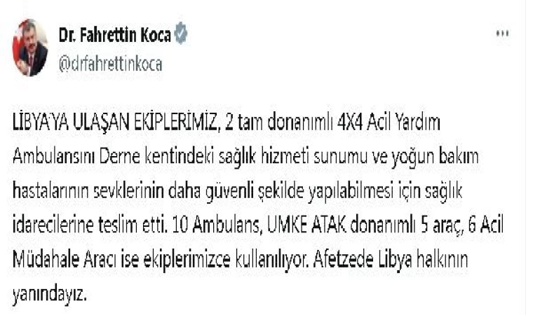 ANKARA, (DHA)- SAĞLIK Bakanı Fahrettin Koca, Libya'ya ulaşan Türk ekiplerinin, 2 tam donanımlı 4X4 Acil Yardım Ambulansını Derne kentindeki sağlık idarecilerine teslim ettiğini açıklayarak, "Afetzede Libya halkının yanındayız" dedi.