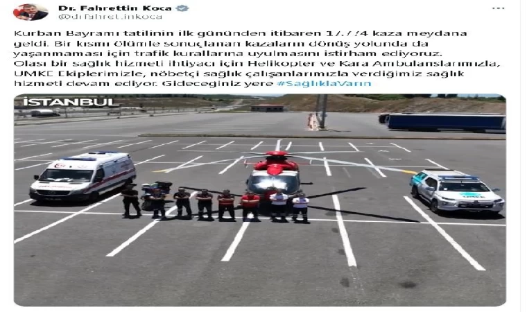 Sağlık Bakanı Koca, Twitter üzerinden yaptığı açıklamada, Kurban Bayramı tatilinin başından bu yana 17,774 kaza meydana geldiğini bildirdi. Bu kazaların bazılarının ölümlere yol açtığını belirterek, dönüş yolculuklarında trafik kurallarına uyulmasını önemle vurguladı. Ayrıca, olası sağlık hizmeti ihtiyaçları için helikopterler, kara ambulanslar, UMKE ekipleri ve nöbetçi sağlık personeli ile hizmet sunulduğunu belirtti. Herkesin güvenli ve sağlıklı bir şekilde varış noktalarına ulaşmasını temenni etti.