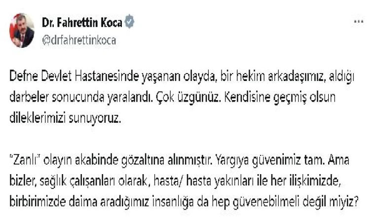 Bakan Koca, sosyal medya üzerinden yaptığı açıklamada, "Defne Devlet Hastanesi'nde yaşanan olayda, bir hekim arkadaşımız, aldığı darbeler sonucunda yaralandı. Çok üzgünüz. Kendisine geçmiş olsun dileklerimizi sunuyoruz. 'Zanlı' olayın akabinde gözaltına alınmıştır. Yargıya güvenimiz tam. Ama bizler, sağlık çalışanları olarak, hasta/hasta yakınları ile her ilişkimizde, birbirimizde daima aradığımız insanlığa da hep güvenebilmeli değil miyiz?" şeklinde konuştu.