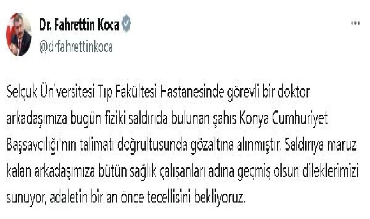 Bakan Koca, Twitter üzerinden yaptığı açıklamada, "Selçuk Üniversitesi Tıp Fakültesi Hastanesi'nde görevli bir doktor arkadaşımıza bugün fiziki saldırıda bulunan şahıs Konya Cumhuriyet Başsavcılığı'nın talimatı doğrultusunda gözaltına alınmıştır. Saldırıya maruz kalan arkadaşımıza bütün sağlık çalışanları adına geçmiş olsun dileklerimizi sunuyor, adaletin bir an önce tecellisini bekliyoruz" dedi. (DHA)