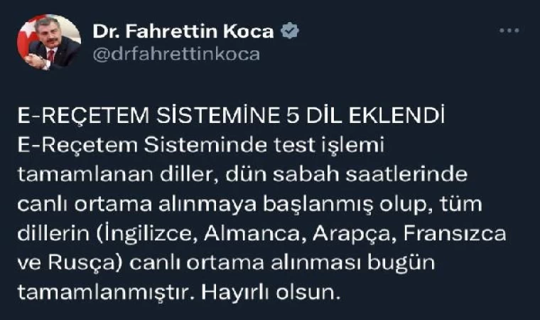 Bakan Koca, Twitter hesabından yaptığı paylaşımda, "E- Reçetem sistemine 5 dil daha eklendi. E-Reçetem Sisteminde test işlemi tamamlanan diller, dün sabah saatlerinde canlı ortama alınmaya başlanmış olup, tüm dillerin (İngilizce, Almanca, Arapça, Fransızca ve Rusça) canlı ortama alınması bugün tamamlanmıştır. Hayırlı olsun" ifadelerine yer verdi. (DHA)