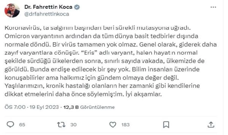ANKARA, (DHA)- SAĞLIK Bakanı Fahrettin Koca, 'Eris' varyantının sınırlı sayıda Türkiye'de de görüldüğü bilgisini paylaşarak, "Bunda endişe edilecek bir şey yok. Bilim insanları üzerinde konuşabilirler; ama halkımız için gündem olmaya değer değil" dedi.