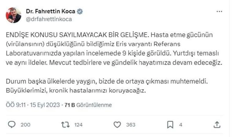 Sağlık Bakanı Fahrettin Koca, Eris varyantının Türkiye'de 9 kişide tespit edildiğini duyurdu. Bakan Koca, sosyal medya üzerinden yaptığı açıklamada, "Eris varyantının virülansının düşük olduğunu biliyoruz. Referans laboratuvarımızda yapılan incelemede bu varyantın 9 kişide görüldüğünü tespit ettik. Bu kişiler yurtdışı temaslı ve aynı il içerisinde bulunuyorlar. Mevcut tedbirlere ve günlük yaşantımıza devam edeceğiz. Bu durumun diğer ülkelerde yaygın olduğunu ve ülkemizde de görülme olasılığının olduğunu biliyorduk. Büyüklerimizi ve kronik hastalarımızı korumak için gereken tedbirleri alacağız" ifadelerini kullandı.