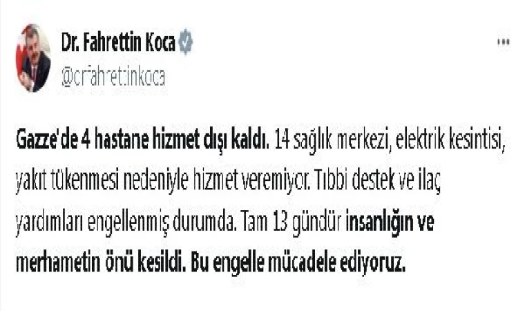Bakan Koca, sosyal medya hesabından yaptığı paylaşımda, "Gazze'de 4 hastane hizmet dışı kaldı. 14 sağlık merkezi, elektrik kesintisi, yakıt tükenmesi nedeniyle hizmet veremiyor. Tıbbi destek ve ilaç yardımları engellenmiş durumda. Tam 13 gündür insanlığın ve merhametin önü kesildi. Bu engelle mücadele ediyoruz" dedi. (DHA)