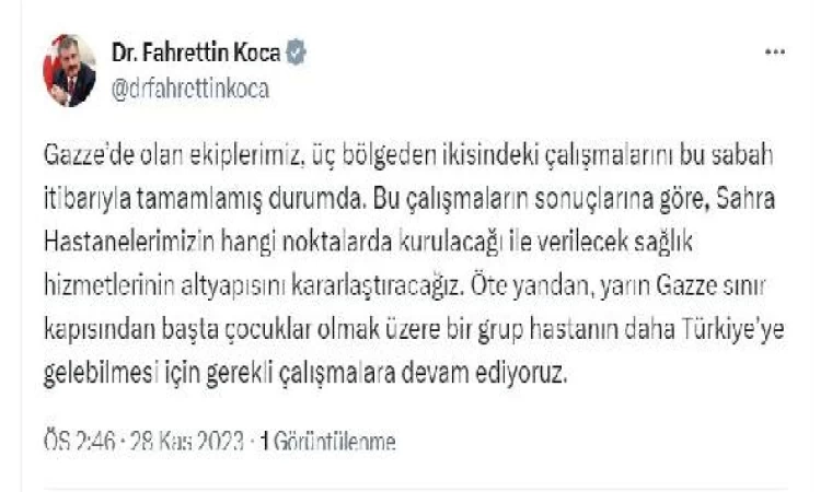 Bakan Koca, sosyal medya hesabından yaptığı açıklamada, "Gazze'de olan ekiplerimiz, üç bölgeden ikisindeki çalışmalarını bu sabah itibarıyla tamamlamış durumda. Bu çalışmaların sonuçlarına göre, Sahra Hastanelerimizin hangi noktalarda kurulacağı ile verilecek sağlık hizmetlerinin altyapısını kararlaştıracağız. Öte yandan, yarın Gazze sınır kapısından başta çocuklar olmak üzere bir grup hastanın daha Türkiye'ye gelebilmesi için gerekli çalışmalara devam ediyoruz" dedi. (DHA)