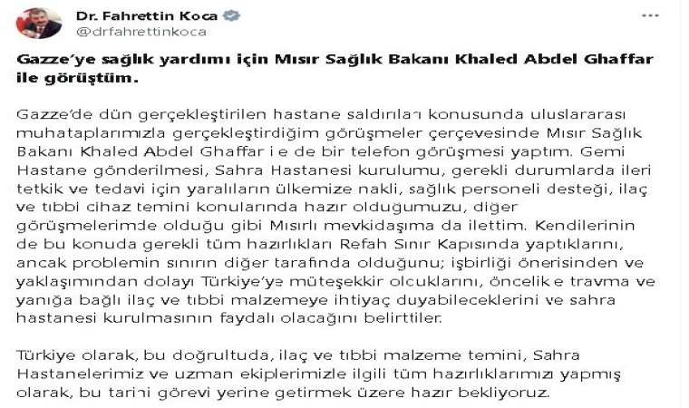 ANKARA, (DHA)- SAĞLIK Bakanı Fahrettin Koca, İsrail saldırısı altındaki Gazze'ye sağlık yardımı için Mısır Sağlık Bakanı Khaled Abdel Ghaffar ile görüştü.