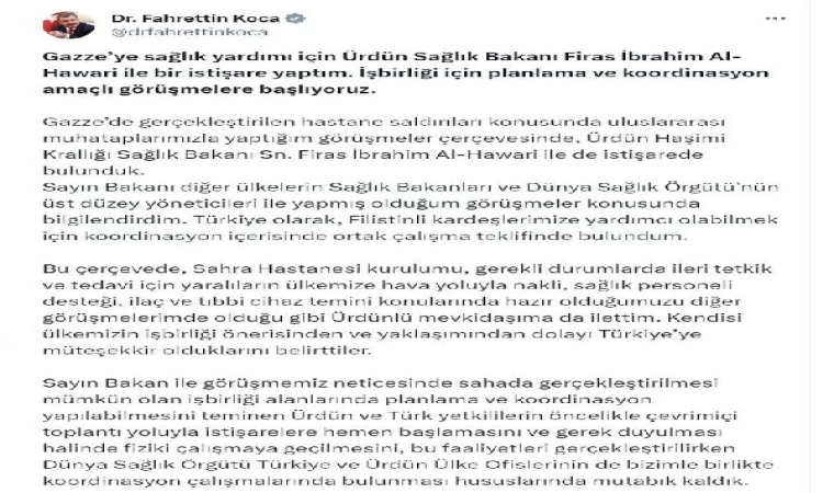 Bakan Koca, sosyal medya hesabından yaptığı açıklamada, "Gazze'ye sağlık yardımı için Ürdün Sağlık Bakanı Firas İbrahim Al-Hawari ile bir istişare yaptım. İş birliği için planlama ve koordinasyon amaçlı görüşmelere başlıyoruz. Gazze'de gerçekleştirilen hastane saldırıları konusunda uluslararası muhataplarımızla yaptığım görüşmeler çerçevesinde, Ürdün Haşimi Krallığı Sağlık Bakanı Sayın Firas İbrahim Al-Hawari ile de istişarede bulunduk. Sayın Bakanı diğer ülkelerin Sağlık Bakanları ve Dünya Sağlık Örgütü'nün üst düzey yöneticileri ile yapmış olduğum görüşmeler konusunda bilgilendirdim. Türkiye olarak, Filistinli kardeşlerimize yardımcı olabilmek için koordinasyon içerisinde ortak çalışma teklifinde bulundum. Bu çerçevede, Sahra Hastanesi kurulumu, gerekli durumlarda ileri tetkik ve tedavi için yaralıların ülkemize hava yoluyla nakli, sağlık personeli desteği, ilaç ve tıbbi cihaz temini konularında hazır olduğumuzu diğer görüşmelerimde olduğu gibi Ürdünlü mevkidaşıma da ilettim. Kendisi ülkemizin iş birliği önerisinden ve yaklaşımından dolayı Türkiye'ye müteşekkir olduklarını belirttiler" dedi.