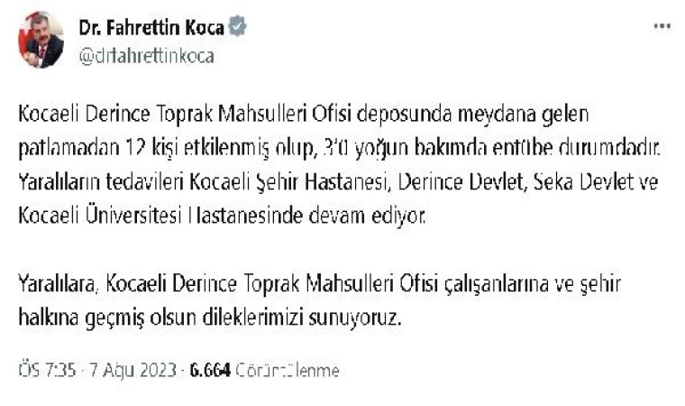 Bakan Koca, Twitter hesabından yaptığı paylaşımda, "Kocaeli Derince Toprak Mahsulleri Ofisi deposunda meydana gelen patlamadan 12 kişi etkilenmiş olup, 3’ü yoğun bakımda entübe durumdadır. Yaralıların tedavileri Kocaeli Şehir Hastanesi, Derince Devlet, Seka Devlet ve Kocaeli Üniversitesi Hastanesi'nde devam ediyor. Yaralılara, Kocaeli Derince Toprak Mahsulleri Ofisi çalışanlarına ve şehir halkına geçmiş olsun dileklerimizi sunuyoruz" ifadelerine yer verdi. (DHA)