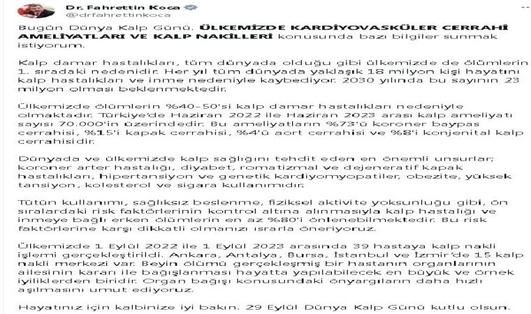 Bakan Koca, sosyal medya hesabı üzerinden 'Dünya Kalp Günü'ne ilişkin açıklamalarda bulundu. Türkiye'deki kardiyovasküler cerrahi ameliyatları ve kalp nakilleri hakkında bilgi veren Bakan Koca, "Kalp damar hastalıkları, tüm dünyada olduğu gibi ülkemizde de ölümlerin 1'inci sıradaki nedenidir. Her yıl tüm dünyada yaklaşık 18 milyon kişi hayatını kalp hastalıkları ve inme nedeniyle kaybediyor. 2030 yılında bu sayının 23 milyon olması beklenmektedir. Ülkemizde ölümlerin yüzde 40-50'si kalp damar hastalıkları nedeniyle olmaktadır. Türkiye'de Haziran 2022 ile Haziran 2023 arası kalp ameliyatı sayısı 70 binin üzerindedir. Bu ameliyatların yüzde 73'ü koroner baypas cerrahisi, yüzde 15'i kapak cerrahisi, yüzde 4'ü aort cerrahisi ve yüzde 8'i konjenital kalp cerrahisidir" açıklamalarında bulundu.