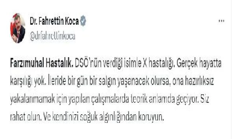 Bakan Koca, sosyal medya hesabından yaptığı açıklamada, "Farzımuhal Hastalık. DSÖ'nün verdiği isimle X hastalığı. Gerçek hayatta karşılığı yok. İleride bir gün bir salgın yaşanacak olursa, ona hazırlıksız yakalanmamak için yapılan çalışmalarda teorik anlamda geçiyor. Siz rahat olun. Ve kendinizi soğuk algınlığından koruyun" dedi. (DHA)