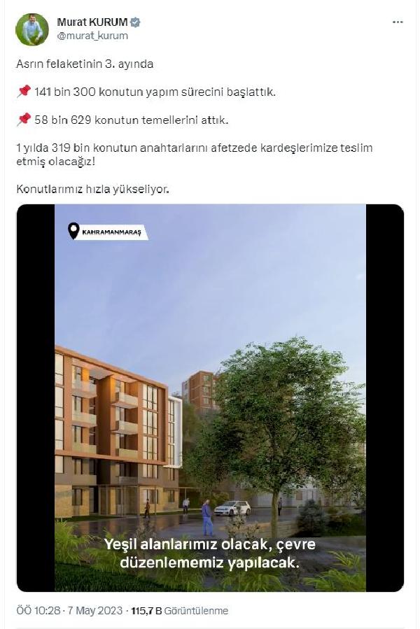 Bakan Kurum: Deprem bölgesinde 141 bin 300 konutun yapım sürecini başlattık