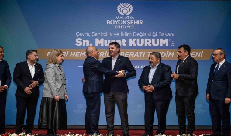 Çeşitli programlar ve deprem sonrası çalışmaları yerinde incelemek üzere Malatya’ya gelen Çevre Şehircilik ve İklim Değişikliği Bakanı Murat Kurum’a Büyükşehir Belediye Meclisi tarafından ‘Fahri Hemşehrilik Beratı’ verildi.