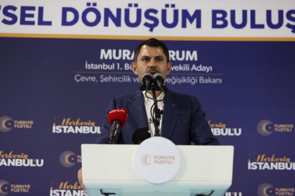 Bakan Kurum, "İstanbul bizim davamızın şehridir. Bu aziz şehri, kimsenin insafına bırakmıyoruz, kimsenin beceriksizliğine terk etmiyoruz. İstanbul'u geleceğe güvenle taşımak için var gücümüzle, gece gündüz demeden çalışıyoruz. Bunun için ne diyoruz? 'Güvenli Konutlar, Huzurlu Yuvalar' 'İstanbul'da 1 buçuk Milyon Konutluk Yüzyılın Dönüşümü', 'Yarısı Bizden, Yarısı Devletten' diyoruz. Buranın altını çizerek söylüyorum; bu dönüşüm dünya tarihinin en büyük şehircilik hamlesidir. Bu dönüşümü siz başlattınız, milletimiz başlattı. Liderimiz, genel başkanımız, Cumhurbaşkanımız Recep Tayyip Erdoğan başlattı" diye konuştu.