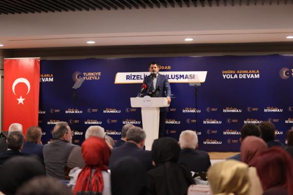 Tuçe Gölcü-Serkan Köymen/İSTANBUL,(DHA)-ÇEVRE, Şehircilik ve İklim Değişikliği Bakanı ve AK Parti İstanbul 1. Bölge Milletvekili Adayı Murat Kurum, Üsküdar'da 'Rizeliler Buluşması' programına katıldı. Bakan Kurum burada yaptığı konuşmasında, “Yatırımlarımızla daima Rize'ye değer kattık, marka değerini yükselttik. TOKİ Başkanlığımızca şehrimize; İyidere ve Rize merkezde olmak üzere toplam büyüklüğü 391 bin metrekare olan millet bahçesi yapıyoruz. Biri sahilde, biri İyidere'de, biri de Güneysu'da. İkisi tamamlandı, bir tanesinin de dolgusu bitti. 10 Mayıs'ta Rize sahili millet bahçesi olacak" dedi.