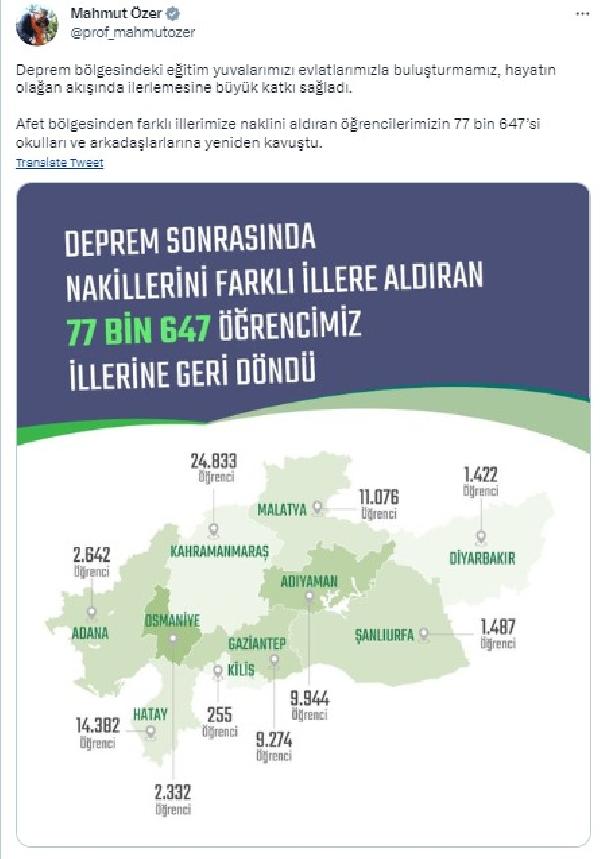 Bakan Özer: Deprem bölgesinden nakil aldıran 77 bin 647 öğrenci illerine döndü