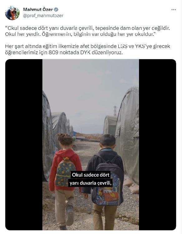 Bakan Özer, paylaşımının devamında, eğitimdeki ilkelerine vurgu yaparak, afet bölgesindeki öğrenciler için Destekleme ve Yetiştirme Kursları'nın (DYK) düzenlendiği 809 farklı noktadan bahsetti. Öğrencilere her koşulda eğitim fırsatı sunmayı amaçladıklarını ifade etti.