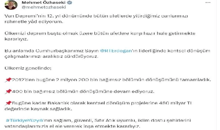 Bakan Özhaseki, sosyal medya hesabından Van depreminin 12'nci yıl dönümü nedeniyle paylaşım yaptı. Özhaseki, "Van depreminin 12'nci yıl dönümünde bütün afetlerde yitirdiğimiz canlarımızı rahmetle yad ediyorum. Ülkemizi deprem başta olmak üzere bütün afetlere karşı hazır hale getirmekte kararlıyız. Bu anlamda Cumhurbaşkanımız Recep Tayyip Erdoğan’ın liderliğinde kentsel dönüşüm çalışmalarımızı aralıksız sürdürüyoruz. Ülkemiz genelinde; 2012’den bugüne 2 milyon 200 bin bağımsız bölümün dönüşümünü tamamladık. 400 bin bağımsız bölümün dönüşümüne devam ediyoruz. Bugüne kadar bakanlık olarak kentsel dönüşüm projelerine 480 milyar TL değerinde kaynak sağladık. Türkiye Yüzyılı'nın sağlam, güvenli, sıfır atık uyumlu, iklim dostu şehirlerini vatandaşlarımızla el ele vererek inşa etmeye kararlıyız" ifadelerini kullandı. (DHA)