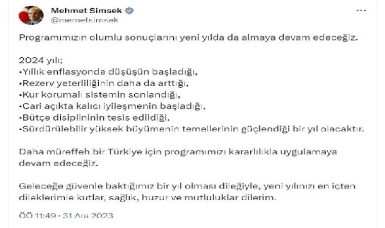 Bakan Şimşek, sosyal medya hesabından yaptığı açıklamada, "Programımızın olumlu sonuçlarını yeni yılda da almaya devam edeceğiz. 2024 yılı; yıllık enflasyonda düşüşün başladığı, rezerv yeterliliğinin daha da arttığı, kur korumalı sistemin sonlandığı, cari açıkta kalıcı iyileşmenin başladığı, bütçe disiplininin tesis edildiği, sürdürülebilir yüksek büyümenin temellerinin güçlendiği bir yıl olacaktır. Daha müreffeh bir Türkiye için programımızı kararlılıkla uygulamaya devam edeceğiz. Geleceğe güvenle baktığımız bir yıl olması dileğiyle, yeni yılınızı en içten dileklerimle kutlar, sağlık, huzur ve mutluluklar dilerim" ifadelerini kullandı. (DHA)
