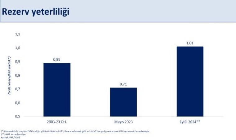 “Brüt rezervlerimiz 156,4 milyar dolarla tarihi yüksek seviyeye ulaştı. Swap hariç net rezervler ise geçen yılın Mayıs ayına göre 90,5 milyar dolar artışla 5,5 yılın zirvesi olan 29,9 milyar dolara yükseldi. Rezerv yeterliliğimiz uluslararası tanıma göre eşik seviyeyi aştı. Programımız sayesinde azalan cari açık ve artan rezervler risk primimizi düşürürken finansal istikrarımızı güçlendiriyor.”