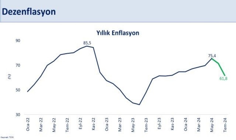 TÜİK tarafından açıklanan enflasyon verileri değerlendiren Hazine ve Maliye Bakanı Mehmet Şimşek, gelecek dönemde enflasyondaki düşüşün daha çok hissedileceğini işaret etti. Bakan Şimşek, sosyal medya hesabından yaptığı paylaşımda “Yıllık enflasyon düşüyor. Temmuzda aylık enflasyon geçici etkiler kaynaklı arttı. Yıllık enflasyon ise hazirana göre 9,8 puan azalarak yüzde 61,8’e geriledi. Ana hedefi dezenflasyon olan programımızın her alanda olumlu sonuçlarını almaya devam ediyoruz. Önümüzdeki dönemde enflasyondaki düşüş daha çok hissedilecek. Fiyat istikrarını sağlayarak vatandaşlarımızın refahını kalıcı olarak artıracağız" ifadelerine yer verdi.