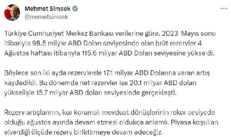 Enes GEYİK/ANKARA, (DHA)- HAZİNE ve Maliye Bakanı Mehmet Şimşek, "Türkiye Cumhuriyet Merkez Bankası verilerine göre, 2023 Mayıs sonu itibarıyla 98,5 milyar ABD Doları seviyesinde olan brüt rezervler 4 Ağustos haftası itibarıyla 115,6 milyar ABD Doları seviyesine yükseldi. Böylece son iki ayda rezervlerde 17,1 milyar ABD Dolarına varan artış kaydedildi" dedi.